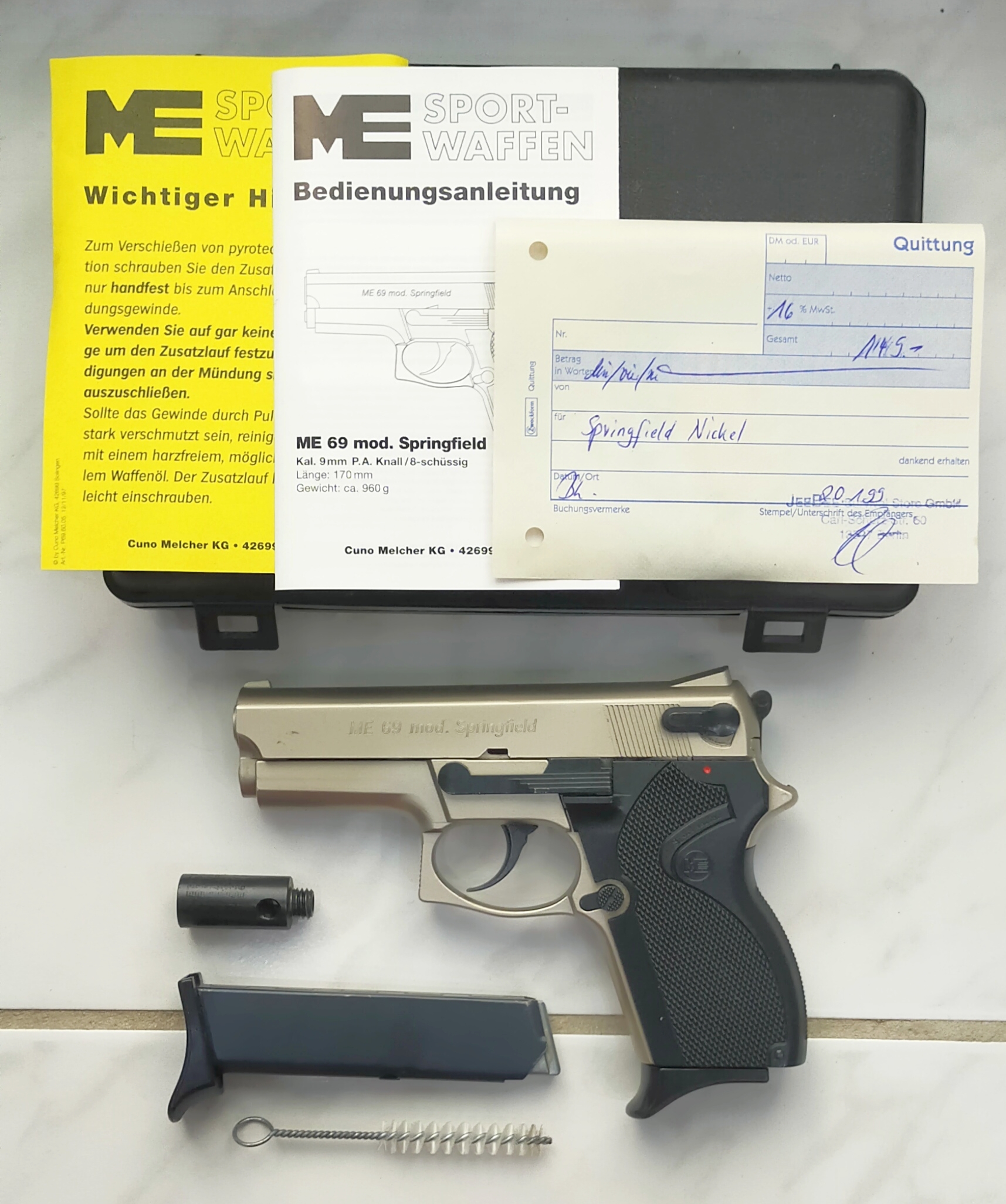 Ich verkaufe hier eine SSW ME 69 Mod. Springfield Nickel im Kaliber 9mmPAK. PTB 679. Beschuss 1999.