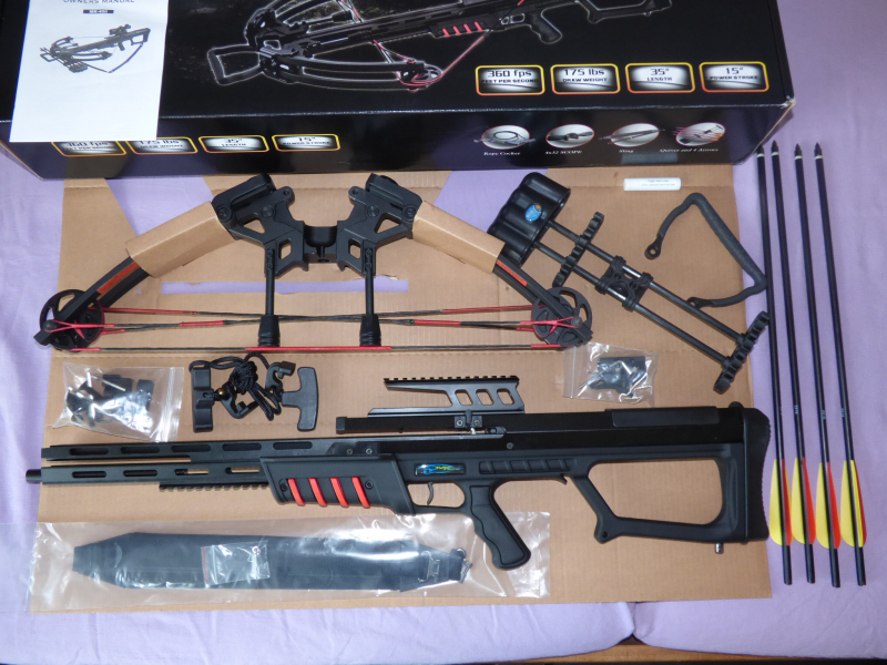 Lieferumfang: Armbrust, 4 Pfeile 20", Anbauköcher für 4 Pfeile, Sehnenwachs, Spannhilfe, gepolsterter Tragegurt, bebilderte Anleitung in englischer Sprache.