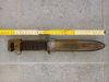 "Original WW2 Military issue, first issued March 1943, discontinued August 1944. 6-5/8 inches blade. 11-5/8 inches overall. Steel guard marked US M3 CAMILLUS. Black Oxide Carbon Steel blade. Grooved leather disk handle. Two pin iron pommel, cap marked with ordinance bomb. Original fiberglass and canvas scabbard with iron throat piece marked U.S. M8 B.M. Co. Web material belt frog and heavy metal hooks"