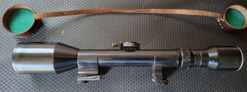 M.S.W. Wetzlar, 6x Vergrößerung mit schnäpper Montage und Abdeckkappe. Alle Teile sind leichtgängig. Zielfernrohr stammt vermutlich aus den Fünfzigern. Klare und scharfe Durchsicht, Absehen 1. Allgemein sehr guter Zustand.