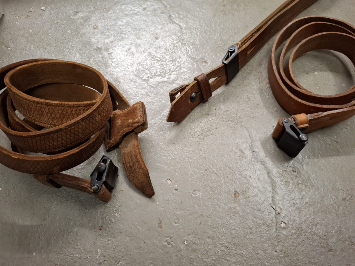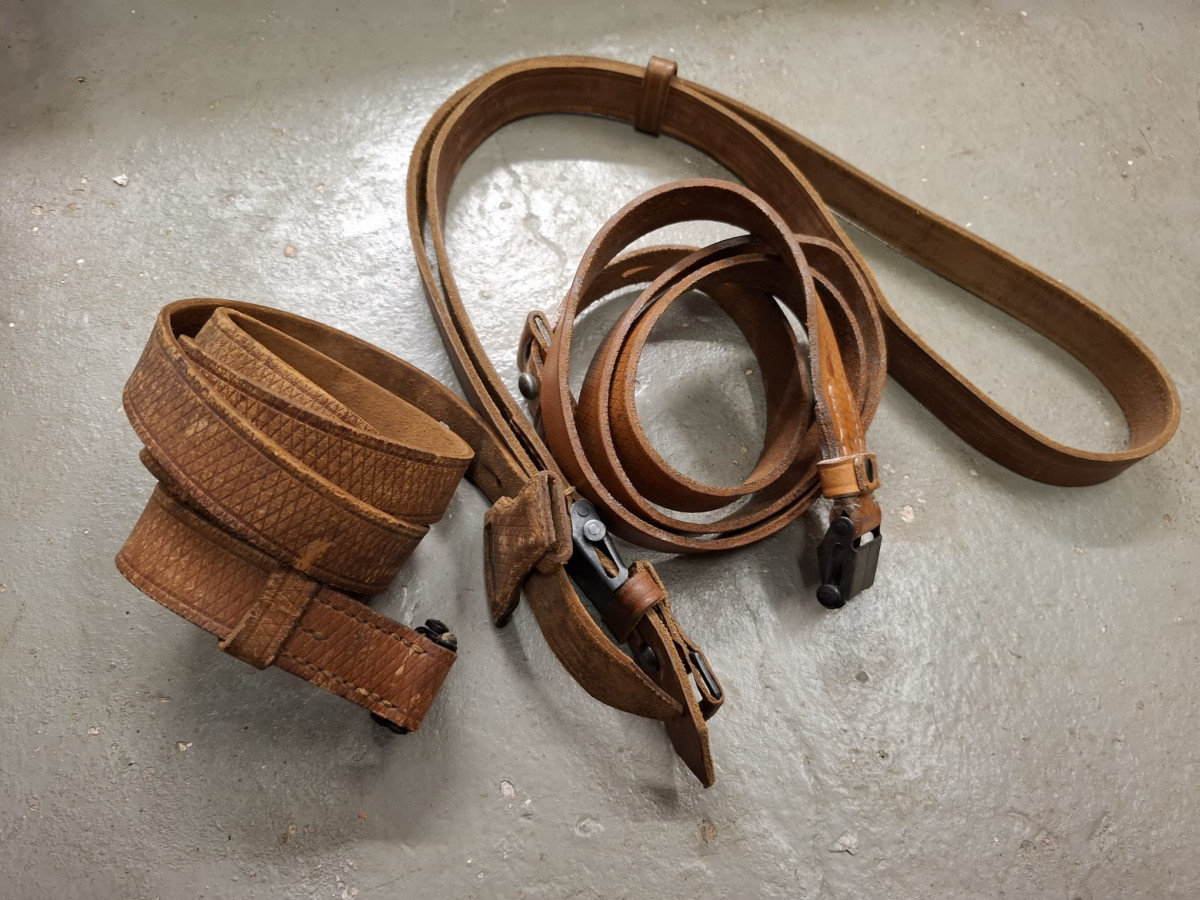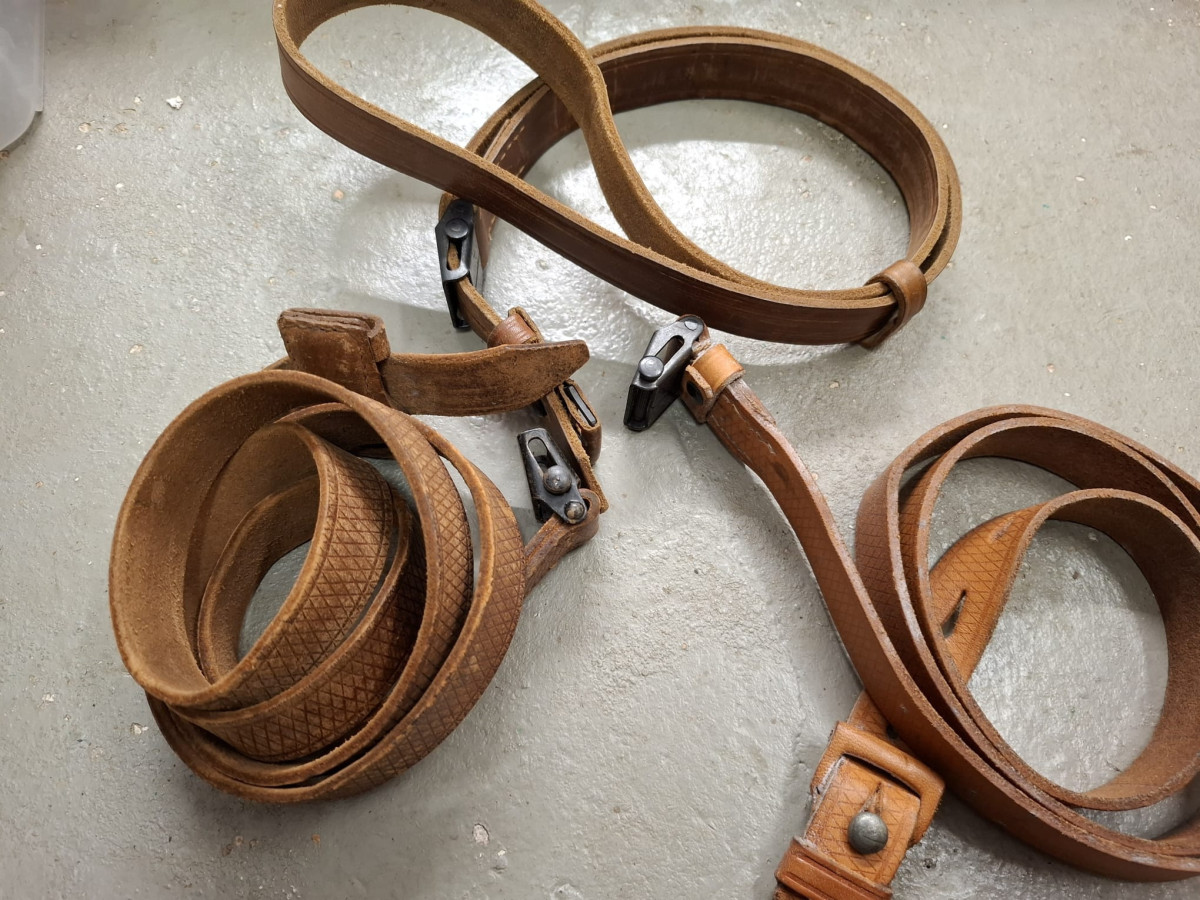 3 Stück Gewehrriemen K98k wie abgebildet, Leder jeweils mit Frosch, gebraucht