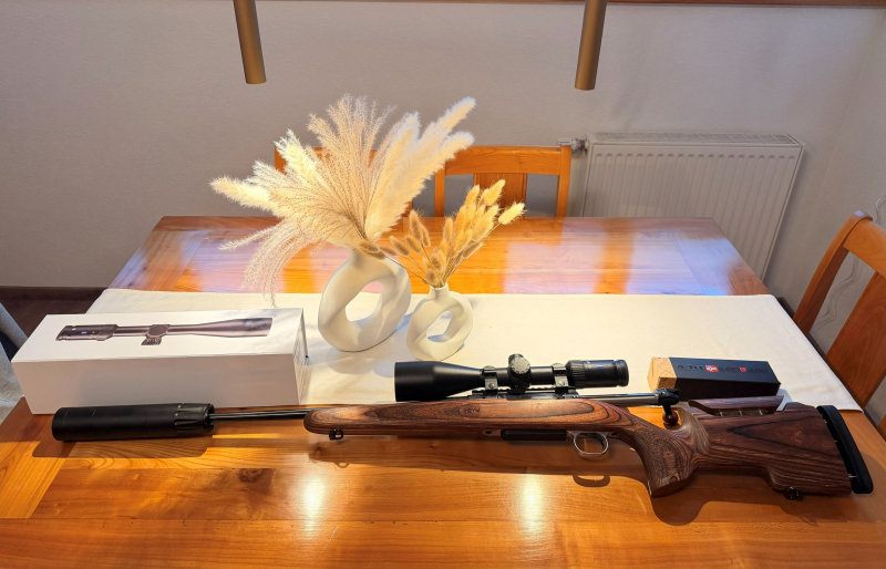 Montiert ist ein Zeiss Conquest V4 3-12x56 mit Absehen 60. Das Glas ist neu und wurde nur zum Einschießen verwendet. Die Montage ist ebenfalls im Lieferumfang enthalten.
