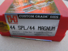 Hier biete ich meinen Reserve-Matrizensatz in .44 Magnum an. Ich habe ihn neuwertig gekauft und selber nicht benutzt, seht die Fotos. Dabei ist ein Hülsenhalter und das original beiliegende Päckchen mit einem Ersatzclip und zwei Ausstoßerstiften, sowie der zweite Setzstempel für Rundkopfgeschosse. Die Hornady Setzmatrize hat einen schwimmenden Setzstempel, der das Geschoss quasi schon bei der Aufwärtsbewegung der Hülse etwas führt und zentriert, die Gefahr des Verkantens beim Laden wird somit verringert.