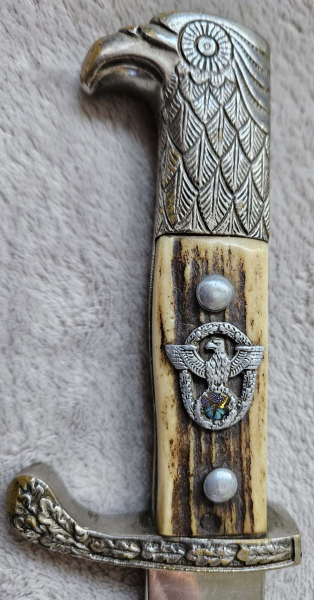 Blanke, saubere Klinge mit Hersteller von Paul Weyersberg & Co., Solingen. Länge der Klinge ca. 33 cm. Alugriffstück; Hirschhorn mit aufgelegtem Polizeiemblem, Griff ca. 10 cm. Parierstange und Scheide mit 4 gestempelt.