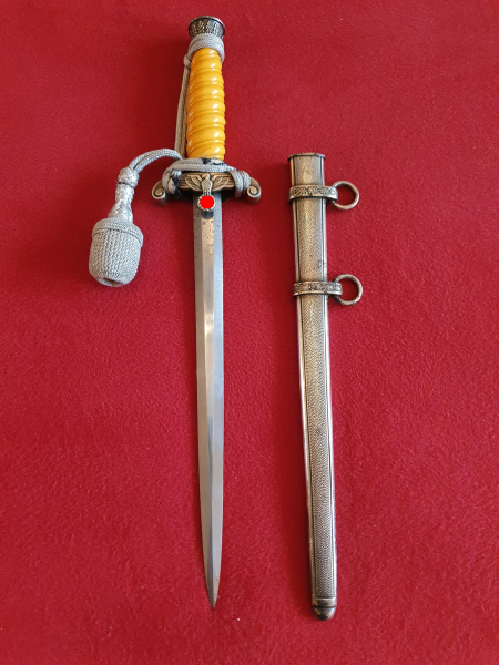 Angeboten wird ein Originaler Heeresoffiziersdolch des seltenen Herstellers H. Kolping / Solingen mit Scheide und Portepee, versilberte Ausführung.