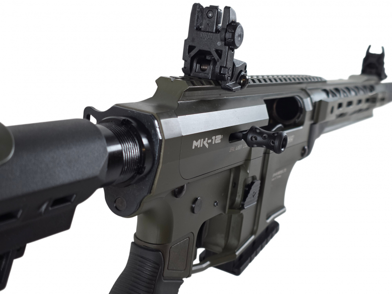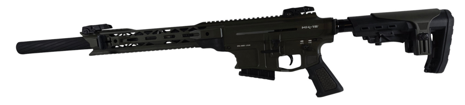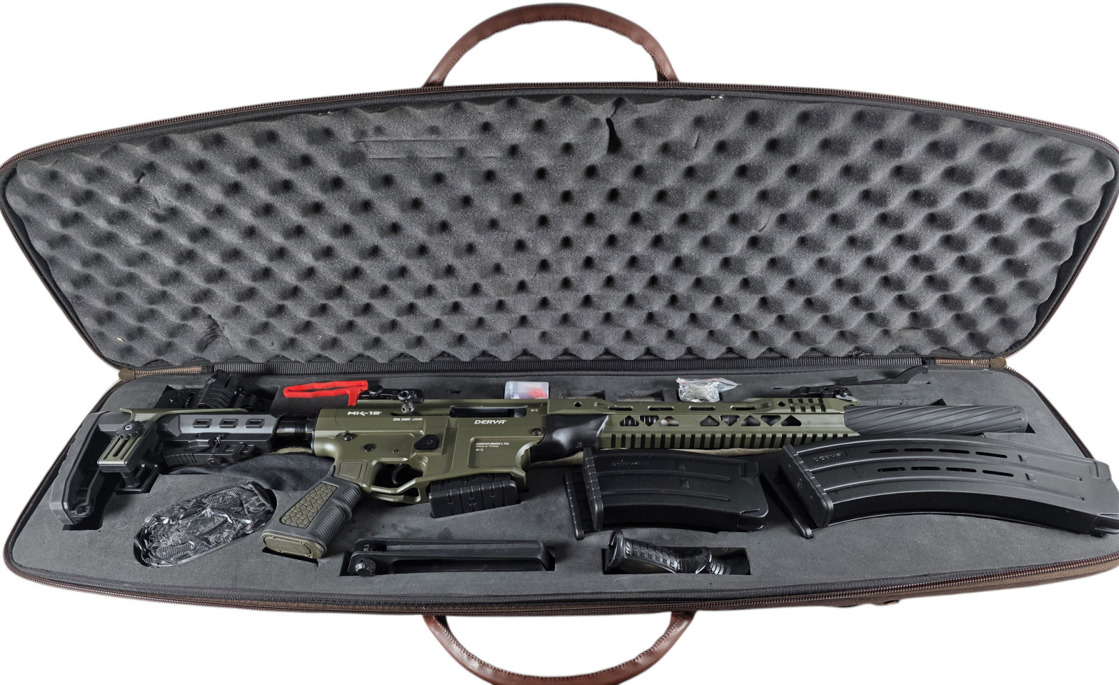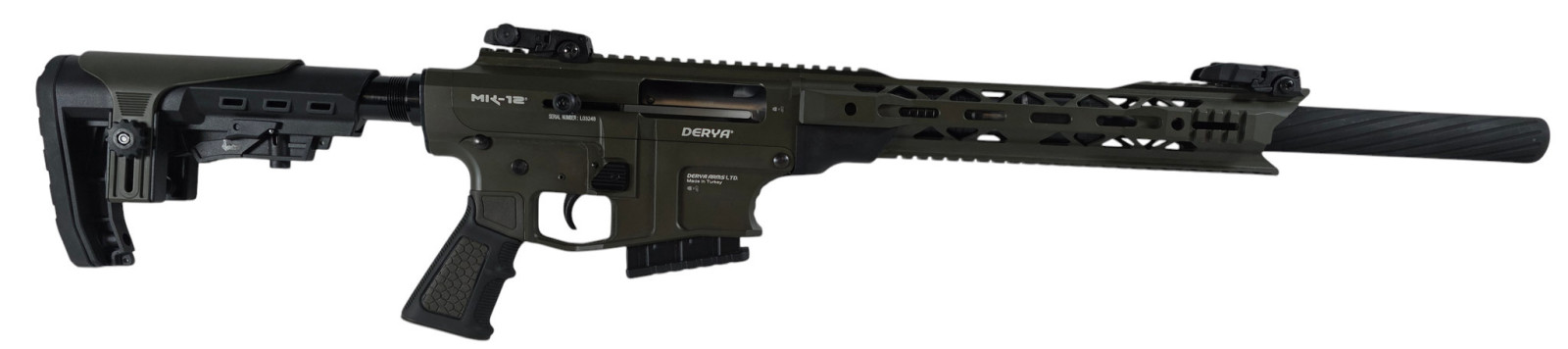 Info: Dieser Derya MK-12 Halbautomat wird in einem wertigen, schönen Koffer in Lederdesign mit folgendem Zubehör geliefert: Offene Visierung mit Traggriff, offene Flip Up Visierung, 45° abgeschrägte CQB-Montage für Zielgeräte, Gewehrriemen, AFG-Vordergriff, 1x 2-Schuss Magazin, 2x 5-Schuss Magazin, 2x 9-Schuss Magazin, 3 Wechselchokes: Zylindrisch, Halb- und Vollchoke, Werkzeug,