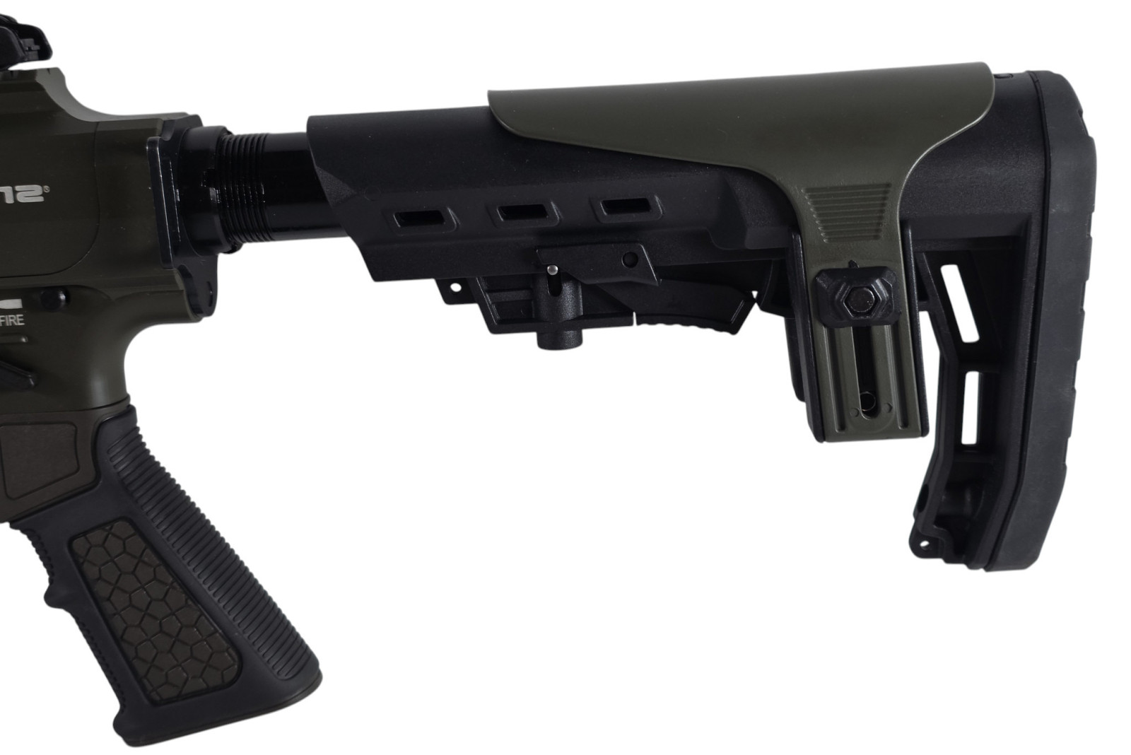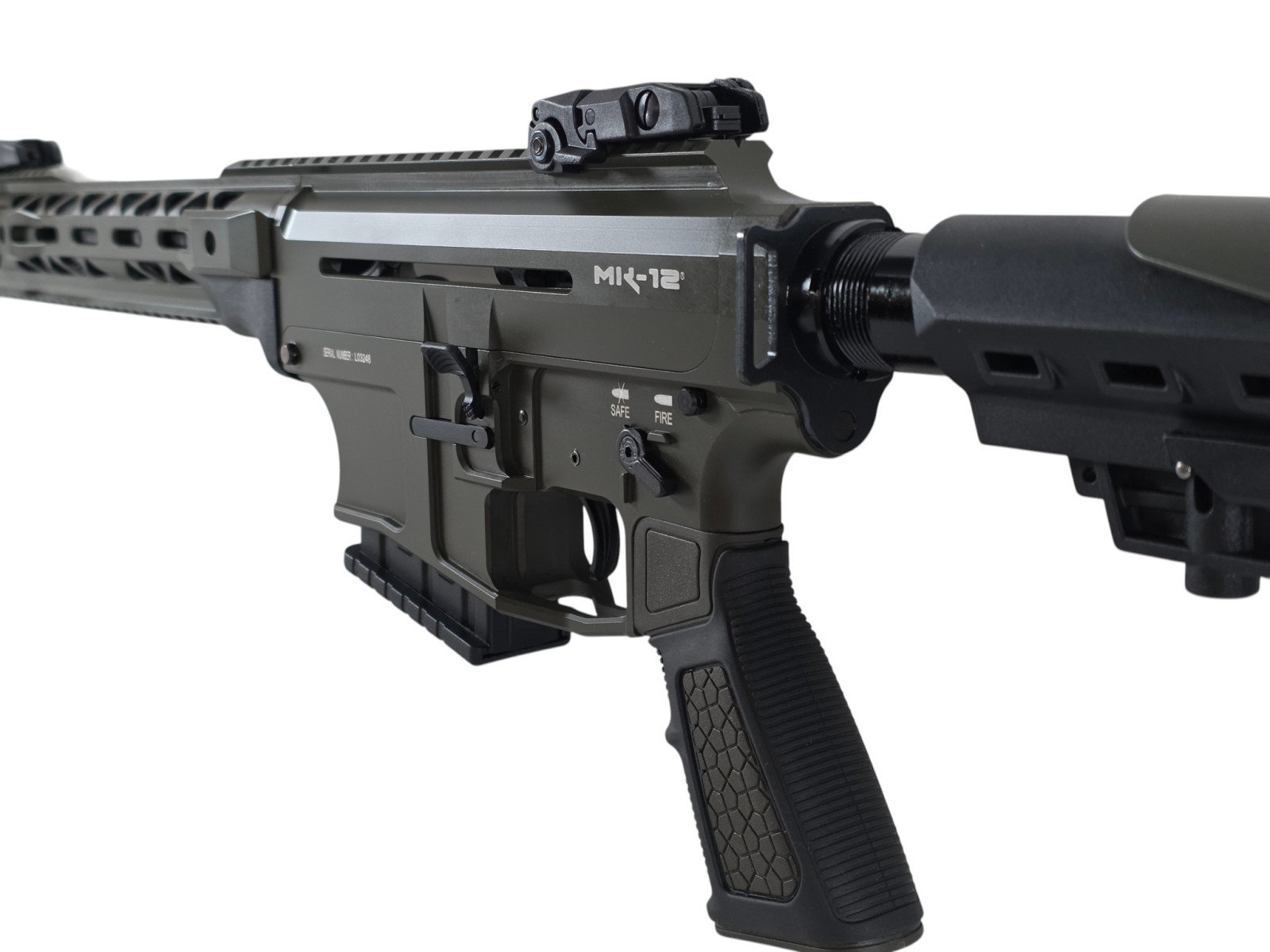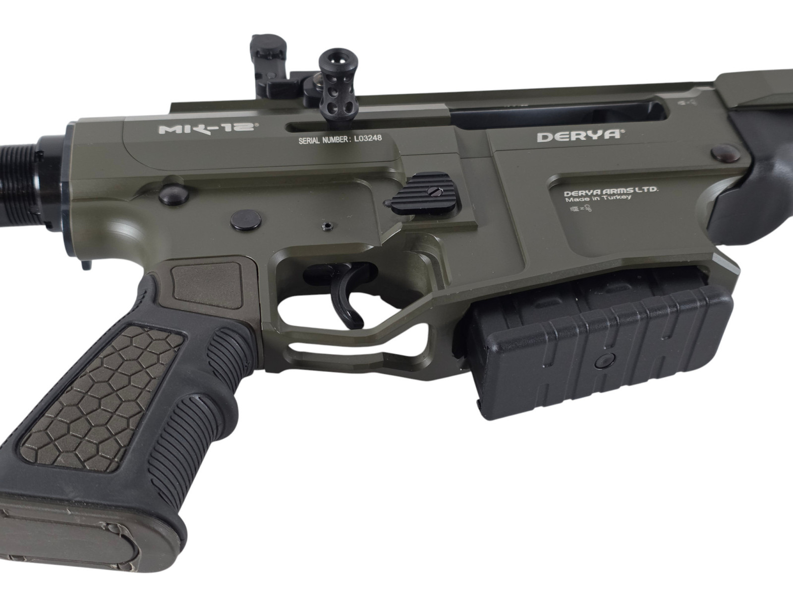 Info: Dieser Derya MK-12 Halbautomat wird in einem wertigen, schönen Koffer in Lederdesign mit folgendem Zubehör geliefert: Offene Visierung mit Traggriff, offene Flip Up Visierung, 45° abgeschrägte CQB-Montage für Zielgeräte, Gewehrriemen, AFG-Vordergriff, 1x 2-Schuss Magazin, 2x 5-Schuss Magazin, 2x 9-Schuss Magazin, 3 Wechselchokes: Zylindrisch, Halb- und Vollchoke, Werkzeug,