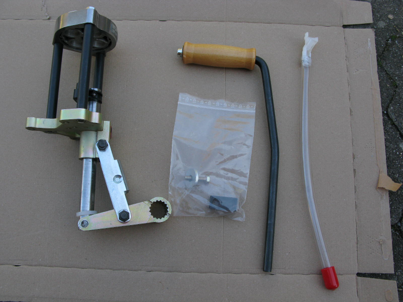 Mit dabei ist der Abführschlauch für ausgestoßene Zündhütchen, der "Roller Handle" Griff (war wohl mal Sonderzubehör) und eine Kopfplatte zur Aufnahme der Matrizen.