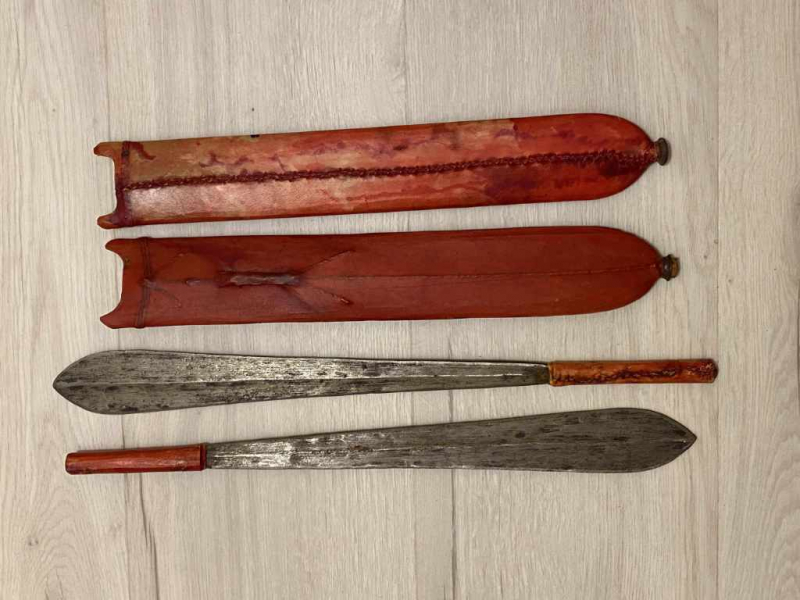 Zwei afrikanische Massai-Messer mit Scheide aus Ziegenhaut. Länge jeweils ca. 55-57 cm.