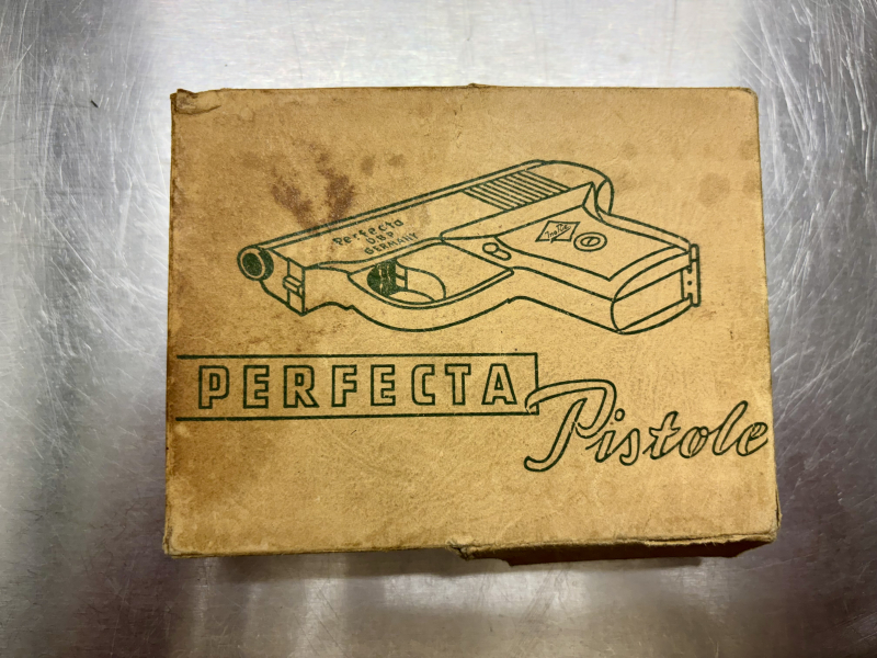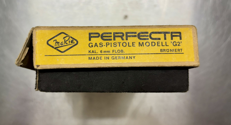 Hier kommt eine Leerverpackung für eine Perfecta G2 Gaspistole zur Auktion. Teilweise eingerissen. Muss ziemlich alt sein, auf jeden Fall lange vor PTB Pflicht. Zustand siehe Bilder