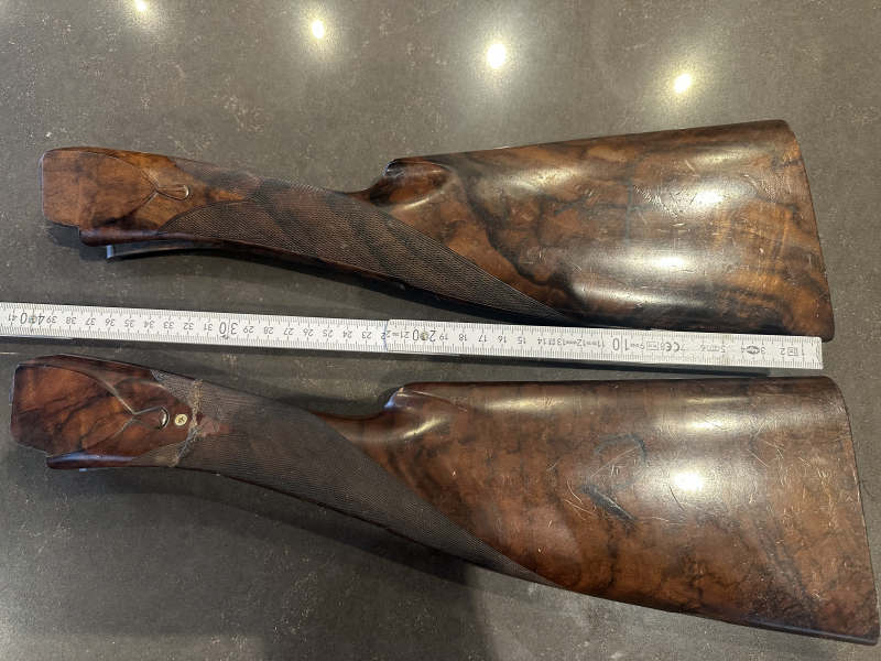 Sie können hier auf zwei alte Hinterschäfte eines FN Pärchens bieten. Einer davon hat einen geklebten und geschraubten Bruch, beide hatten einen goldenen Monogrammnagel, der entfernt wurde. Ebenso wurde die Dchaftverschraubung unsensibel gesucht, was man mit einer Schaftkappe beheben kann.