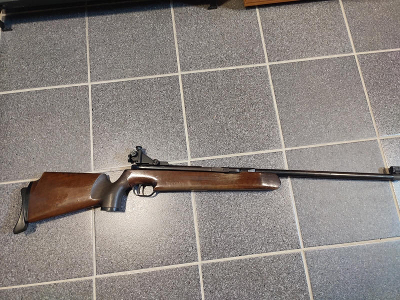Aufgrund von Zeit- und Platzmangel muss ich meine Luftgewehrsammlung nun endgültig auflösen. Angeboten wird ein Feinwerkbau 300 mit F im Fünfeck in funktionsfähigem Zustand. Zur genauen Geschwindigkeit der Diabolos kann ich keine Angabe machen. Dennoch würde dem Gewehr aufgrund des Alters sicher eine Revision und der Tausch der Dichtungen gut tun. Das Holz hat ein einige Dellen und Schrammen (Siehe Bilder), daher bietet sich sicherlich auch hier eine Aufbereitung an. Das System und der Lauf weisen sowohl Flugrostspuren, als auch eine stark abgegriffene Brünierung auf. Möglicherweise kann man hier noch nachbrünieren. Der vorhandenen Diopter lässt sich leichtgängig verstellen und ist noch in einem sehr guten Zustand.
