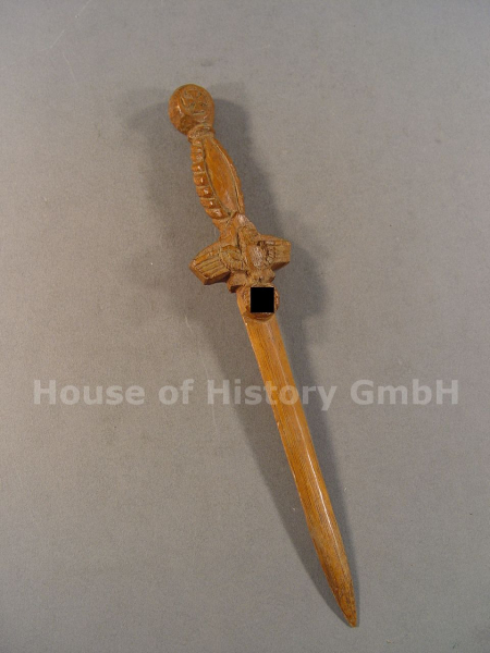 Wehrmacht Heer an der Front aus Holz geschnitzter Brieföffner in Form eines Dolches mit Hoheitsadler als Parierstange, Länge 22,5 cm, rückseitig mit geschnitzter Bezeichnung "Kruse (19)42 Durhowschtschirc", sehr schöne dekorative Arbeit eines Frontsoldaten