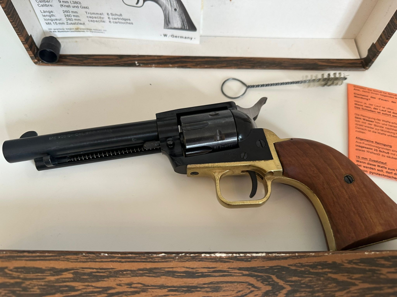 Der Revolver befindet sich in einem sehr gepflegten Zustand und wurde stets sorgfältig aufbewahrt. Gebrauchsspuren sind – wenn überhaupt – nur minimal vorhanden. Besonders hervorzuheben ist die seltene Verfügbarkeit dieses Modells, wodurch es sich ideal für Sammler oder Liebhaber klassischer Schreckschusswaffen eignet.