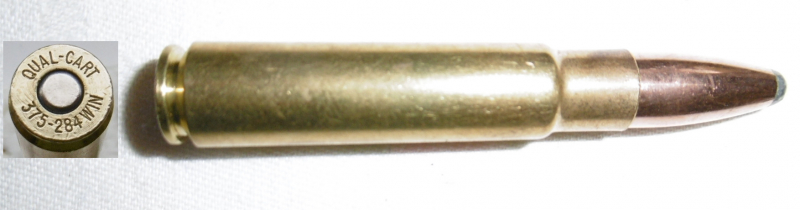 eine Deko-Patrone .375-284 Winchester ( QUAL-CART 375-284 ) eine .375-wildcat in .284 Win-Hülse. Quality-Cartridge stellt ehemalige wildcats als Kleinserie mit korrektem Kaliber im Bodenstempel her. Patrone ist ohne Ladung, zum Nachweis ist eine Klapper-Kugel eingelegt.