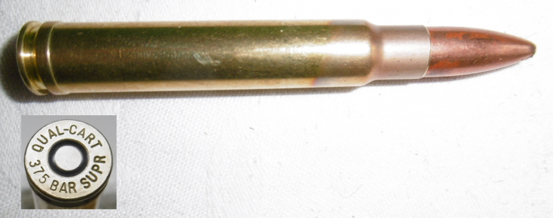 eine Deko-Patrone .375 Barnes Supreme ( QUAL-CART 375 BAR SUPR ) Quality-Cartridge stellt ehemalige wildcats als Kleinserie mit korrektem Kaliber im Bodenstempel her. Patrone ist ohne Ladung, zum Nachweis ist eine Klapper-Kugel eingelegt.