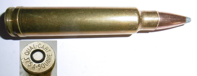 eine Deko-Patrone .375 A-Square ( QUAL-CART 375 A-SQUARE ) Quality-Cartridge stellt ehemalige wildcats als Kleinserie mit korrektem Kaliber im Bodenstempel her. Patrone ist ohne Ladung, zum Nachweis ist eine Klapper-Kugel eingelegt.