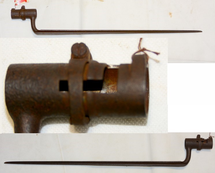 Tüllenbajonett, ev. für das französische Steinschloss-Infanteriegewehr Modell 1822, Klingenlänge 46cm, Innendurchmesser der Tülle 21,5 mm, Schlitzbreite 5,6mm, für Kornlänge 6,7mm, rostig