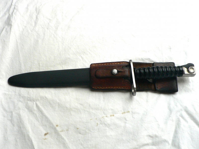 Bestens erhaltenes Bajonett für das StGw 57, gestempelt „F+W“ im Kreis, Nr. W45280, mit Frosch datiert 1979, Drücker funktioniert