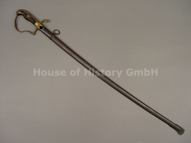 Heeres Offizierssäbel mit Portepee, Hersteller: WKC Solingen, seltenes Modell mit "Parteiadler", vergoldete Messing Ausführung, Griffwicklung vollständig intakt, Gesamtlänge 93 cm, brünierte Originalscheide, Gefäß mit leichter Verformung (siehe Fotos), sonst schönes leicht getragenes Stück, seltenes Modell