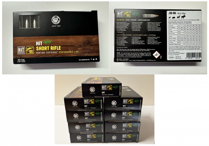 Biete 9 Packungen der RWS Hit Short Rifle Kaliber .30-06 an. Die Packungen sind original verschlossen und alle aus dem gleichen Los. Ich verkaufe diese hervorragende Munition, da ich auf ein anderes Kaliber umgestiegen bin.