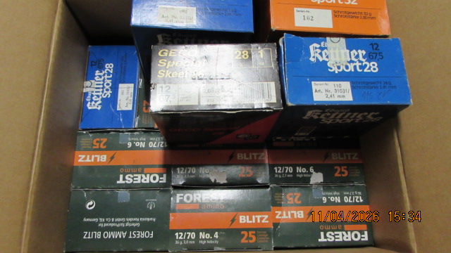 Sie bieten auf ein Munitionskonvolut im Kaliber 12/70, 12/67,5; der Lieferumfang entspricht der Abbildung. Es ist möglich, dass vereinzelte Patronen bereits Lagerspuren haben, einzelne Packungen sind nicht voll und wir können auch nicht ausschließen, dass zwischendurch eine Patrone mit einem anderen Geschoss/Körnung dazwischen ist als auf der Packung steht. Bitte keine Nachfragen, welche Packungen voll sind und welche angebrochen; wer das wissen möchte, kann gerne gucken kommen.
