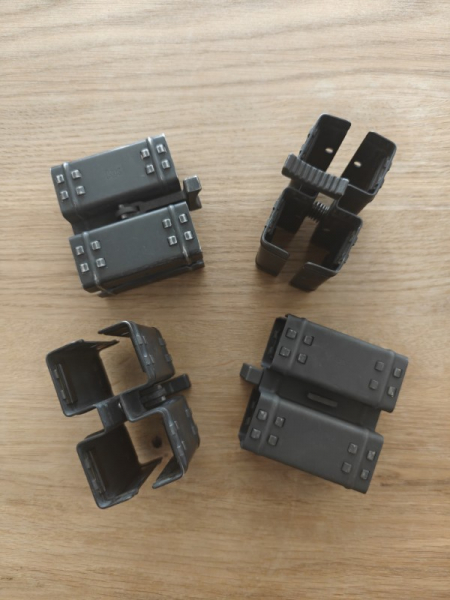 General information: For sale genuine HK dual magazine clamps for twice the rounds exactly where you need them. This is also a great way to swap between two different types of ammo, like FMJ and JHPs or super and subsonic rounds. Great for competition shooting or tactical purposes. These clamps work with all 40, 30, 20, 15, and 10 round steel, curved magazines.
