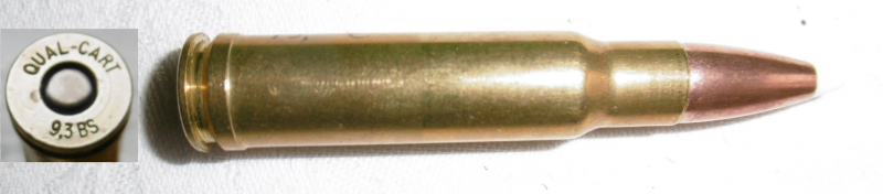 eine Deko-Patrone 9,3 Baesness-Sisk ( QUAL-CART 9.3 B-S ) von John Baesness und Charly Sisk 2005 aus 6,5 Remington Mag-Hülse entwickelt. Quality-Cartridge stellt ehemalige wildcats als Kleinserie mit korrektem Kaliber im Bodenstempel her. Patrone ist ohne Ladung, zum Nachweis ist eine Klapper-Kugel eingelegt.