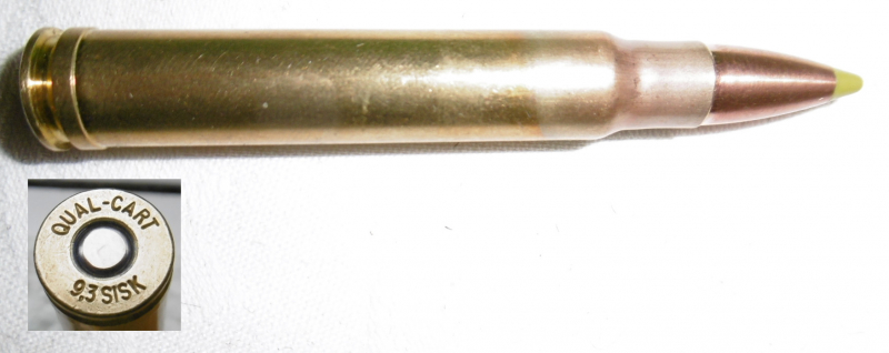 eine Deko-Patrone 9,3 Sisk ( QUAL-CART 9.3 SISK ) von Charly Sisk von Sisk Rifles Co. 2003 aus 8mm Remington Mag-Hülse entwickelt. Quality-Cartridge stellt ehemalige wildcats als Kleinserie mit korrektem Kaliber im Bodenstempel her. Patrone ist ohne Ladung, zum Nachweis ist eine Klapper-Kugel eingelegt.
