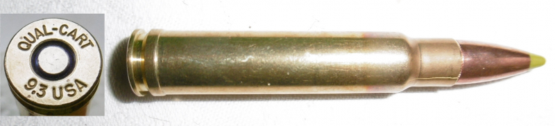 eine Deko-Patrone 9,3 U S A ( QUAL-CART 9.3 USA ) Quality-Cartridge stellt ehemalige wildcats als Kleinserie mit korrektem Kaliber im Bodenstempel her. Patrone ist ohne Ladung, zum Nachweis ist eine Klapper-Kugel eingelegt.