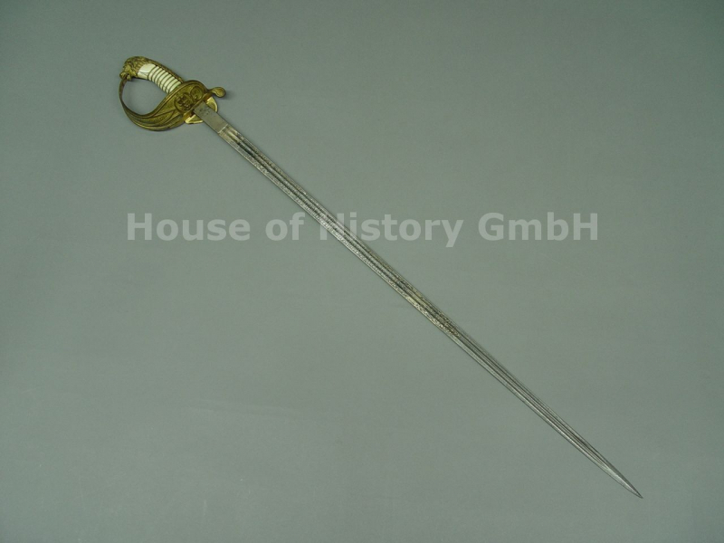 KAISERLICHE MARINE OFFIZIERS ABSCHIEDSGESCHENKDEGEN für den Kommandeur des I.SEEBATAILLON Oberstleutnant Kurt Lölhöffel von Löwensprung, typisches Gefäß wie Offizierssäbel der Kaiserlichen Marine aus Messing feuervergoldet, Löwenkopf, schlankes Gefäß mit Anker unter Kaiserkrone, das Gefäß fein von Hand nachgestochen, hinterer Handschutz klappbar, Elfenbeingriff mit vollständiger Griffwicklung, der Elfenbeingriff mit einigen Spannungsrissen, GERADE DEGENKLINGE aus DAMASTSTAHL wie IOD Klinge mit zwei Hohlkehlen, Klingenrücken mit Hersteller: E.& F.Hörster Solingen, vorderseitig ca.2/3 der Klinge mit geätzter Geschenkwidmung "Dem scheidenden Kommandeur Herrn Oberst-Lieutenant Lölhöffel von Löwensprung 1883 - 1894 das Offizierskorps des I.Seebataillons", sowie maritimen und floralen Motiven, die Schrift und Motive mit Resten der Vergoldung und Bläuung, rückseitig 2/3 der Klinge mit den geätzten Namen der schenkenden Offiziere "v.Fransecky, Henz, v.Kehler, Altritt, Black Swinton, v.Stosch, Crüger, Mauve, Hübsch, Frhr.v.Liliencron, v.Conta, v.Stechow, v.Bahl, Prense, Thierry, Schaefer, v.riedler, Reeschke, v.Hassel, Toelle, v.Heyking", sowie maritimen und floralen Motiven, die Schrift und Motive mit Resten der Vergoldung und Bläuung (leider ist die Klinge des Degen in keinem schönen Zustand da die Gerbsäure der Lederscheide die Oberfläche angegriffen hat, es ist aber soweit noch alles lesbar), die Scheide fehlt (die Scheide war vermutlich eine Lederscheide wie bei den Marinesäbeln mit entsprechenden Beschlägen, aber GERADE für DEGEN), extrem seltene Blankwaffe und Abschiedsgeschenk des I.Seebataillon jedoch wie beschrieben ohne Scheide und mit angegriffener Klinge, aufgrund des Zustand günstig angesetzt
