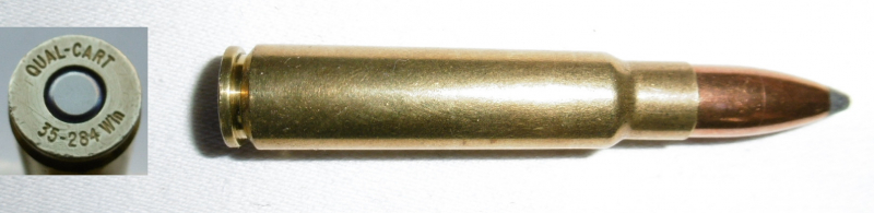 eine Deko-Patrone .35-284 Winchester ( QUAL-CART 35-284 ) eine .358-wildcat in .284 Win-Hülse. Quality-Cartridge stellt ehemalige wildcats als Kleinserie mit korrektem Kaliber im Bodenstempel her. Patrone ist ohne Ladung, zum Nachweis ist eine Klapper-Kugel eingelegt.