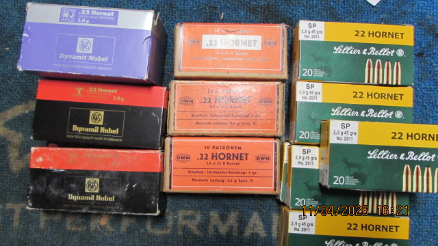 Sie bieten auf ein Munitionskonvolut im Kaliber .22Hornet; der Lieferumfang entspricht der Abbildung. Es ist möglich, dass vereinzelte Patronen bereits Lagerspuren haben, einzelne Packungen sind nicht voll und wir können auch nicht ausschließen, dass zwischendurch eine Patrone mit einem anderen Geschoss/Körnung dazwischen ist als auf der Packung steht. Bitte keine Nachfragen, welche Packungen voll sind und welche angebrochen; wer das wissen möchte, kann gerne gucken kommen.