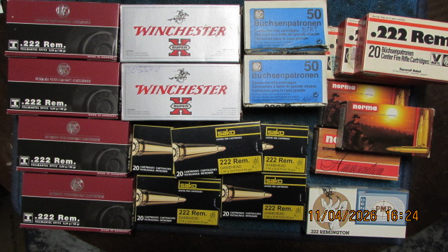 Sie bieten auf ein Munitionskonvolut im Kaliber .222Rem; der Lieferumfang entspricht der Abbildung. Es ist möglich, dass vereinzelte Patronen bereits Lagerspuren haben, einzelne Packungen sind nicht voll und wir können auch nicht ausschließen, dass zwischendurch eine Patrone mit einem anderen Geschoss/Körnung dazwischen ist als auf der Packung steht. Bitte keine Nachfragen, welche Packungen voll sind und welche angebrochen; wer das wissen möchte, kann gerne gucken kommen.