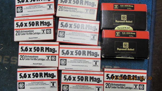 Sie bieten auf ein Munitionskonvolut im Kaliber 5,6x50RMag; der Lieferumfang entspricht der Abbildung. Es ist möglich, dass vereinzelte Patronen bereits Lagerspuren haben, einzelne Packungen sind nicht voll und wir können auch nicht ausschließen, dass zwischendurch eine Patrone mit einem anderen Geschoss/Körnung dazwischen ist als auf der Packung steht. Bitte keine Nachfragen, welche Packungen voll sind und welche angebrochen; wer das wissen möchte, kann gerne gucken kommen.