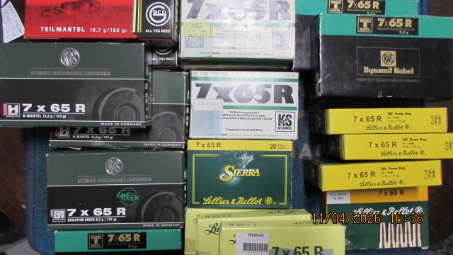 Sie bieten auf ein Munitionskonvolut im Kaliber 7x65R; der Lieferumfang entspricht der Abbildung. Es ist möglich, dass vereinzelte Patronen bereits Lagerspuren haben, einzelne Packungen sind nicht voll und wir können auch nicht ausschließen, dass zwischendurch eine Patrone mit einem anderen Geschoss/Körnung dazwischen ist als auf der Packung steht. Bitte keine Nachfragen, welche Packungen voll sind und welche angebrochen; wer das wissen möchte, kann gerne gucken kommen.