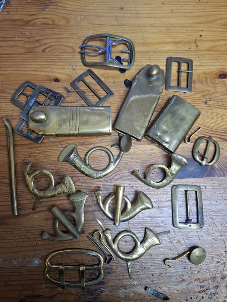 Sammelsurium Restbestände , alles massiv Messing - Mundbleche für Degen/Säbel , Schnallen , Hörner für leicht. Infanterie / Jägereinheiten , , Eigenprodukt vom Schuhnagel - Bestandsauflösung da der Schuhnagel.de schließt