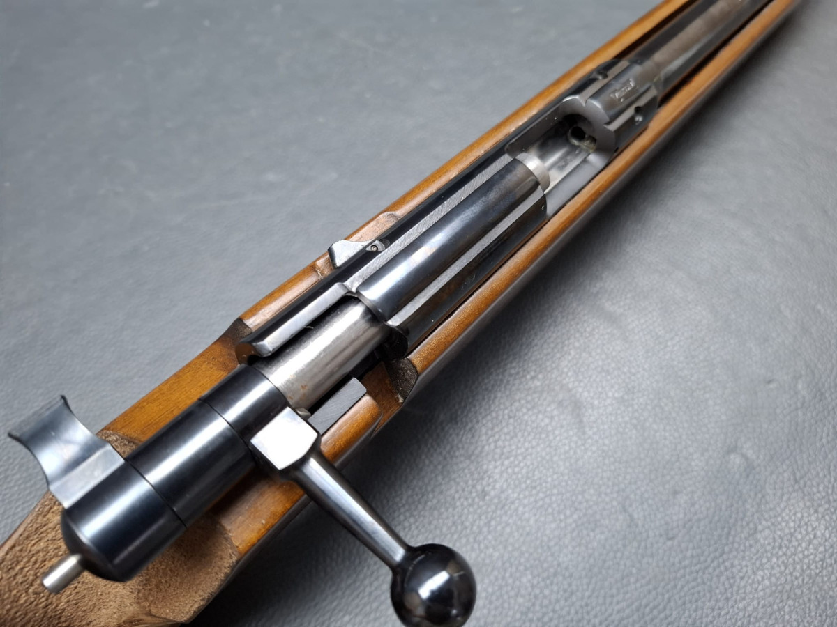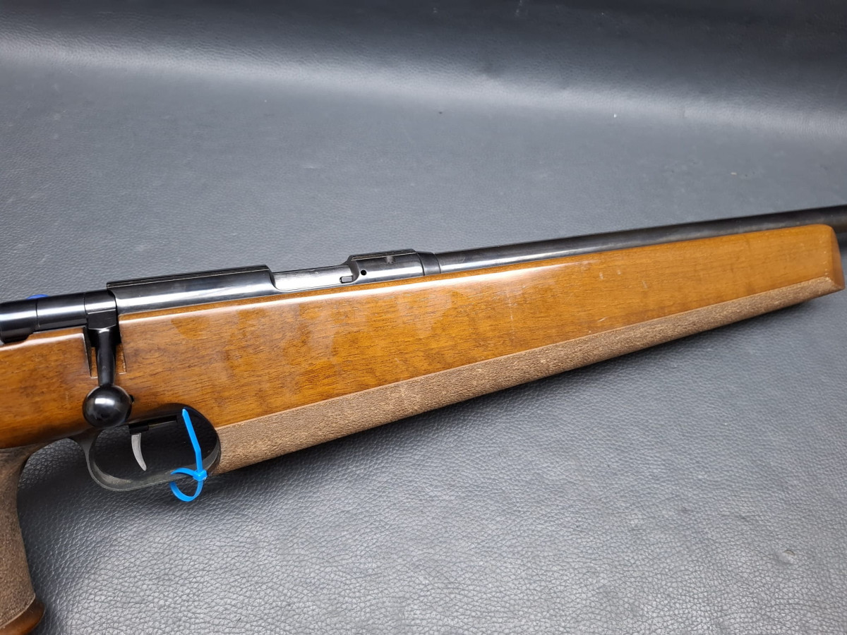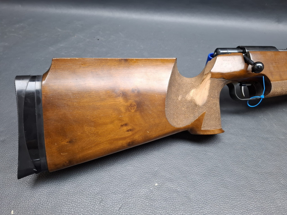 21 mm dicker Matchlauf, 11 mm Schiene Zylinderverschluss mit Flügelsicherung, einstellbarer Matchabzug. Nussbaumschaft mit verstellbarer Schaftkappe, 11mm UIT Schiene Lauf sehr gut, Brünierung 96%, Schaft mit Gebrauchsspuren, Gebrauchtwaffe