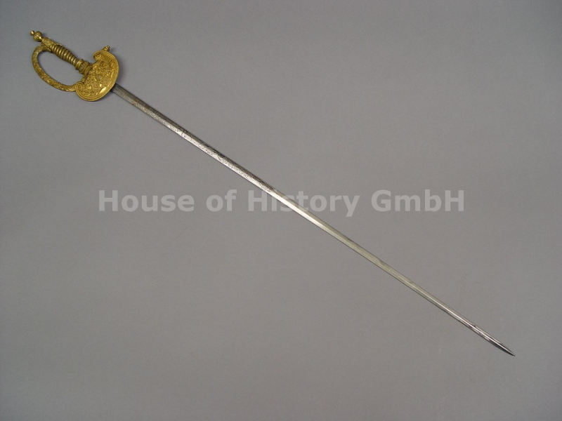 Degen M 1855 für Staatsbeamte, zweischneidige reich floral geätzte Klinge, auf der Fehlschärfe mit Herstellerstempel "E.& F.Hörster Solingen", reich reliefiertes Messingbügelgefäss mit noch schöner Vergoldung, am Stichblatt russischer Doppeladler, ohne Scheide, sehr schöner Zustand, selten