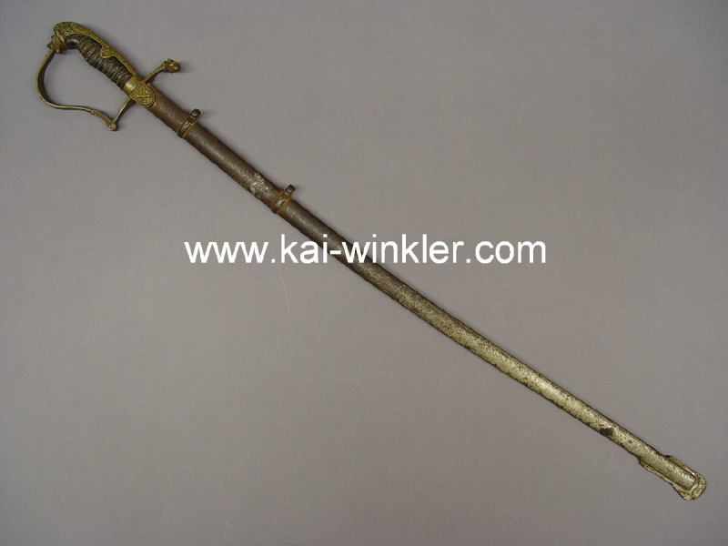 Preußen Artillerie Offiziers Löwenkopfsäbel für KINDER (!!!), Messinggefäß mit Löwenkopf, auf dem vorderen Parierlappen mit gekreuzten Kanonen, Griff aus Leder mit Metaldrahtwicklung (beschädigt !), einfache vernickelte Eisenklinge, Eisenscheide mit Doppelaufhängung, Gesamtlänge 77,5 cm, schöner getragener Zustand, sehr detailgetreu ausgeführter Kindersäbel, selten