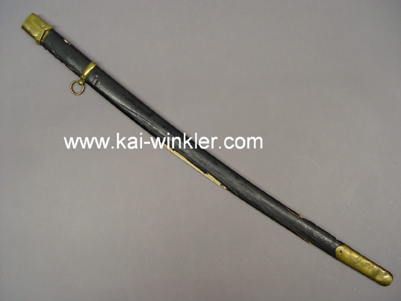 SCHEIDE zu einer Schaschka M 1909 für Offiziere, schwarze leicht geschwungene Scheide mit Messingbeschlägen und einem Tragering, die Schwärzung der Holzscheide ist eine Art Vulkanfiber (ähnlich der Beschichtung von Pickelhauben), Gesamtlänge 77 cm, maximale Breite Klingeneinschub 28,8 mm, maximale Höhe Klingeneinschub 6,5 mm, schöner getragener Zustand mit Papieranhaftungen, seltenes Ersatzteil
