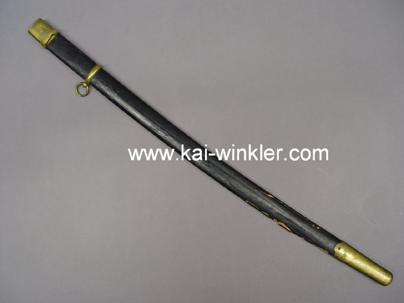 SCHEIDE zu einer Schaschka M 1909 für Offiziere, schwarze leicht geschwungene Scheide mit Messingbeschlägen und einem Tragering, die Schwärzung der Holzscheide ist eine Art Vulkanfiber (ähnlich der Beschichtung von Pickelhauben), Gesamtlänge 75 cm, maximale Breite Klingeneinschub 27,5 mm, maximale Höhe Klingeneinschub 8,2 mm, schöner getragener Zustand mit Papieranhaftungen, seltenes Ersatzteil
