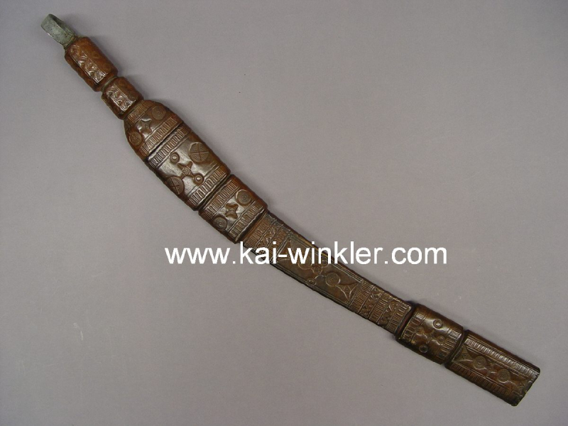 Kurzer Säbel oder Dolch wohl Afrika um 1900, Griff und Scheide aus braunem Leder mit reichlich geprägten Verzierungen, Klinge aus Stahl mit wellenförmigen Verzierungen, Gesamtlänge 60,5 cm, sehr schöner Zustand mit leichten Gebrauchsspuren, dekorativ