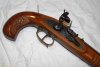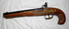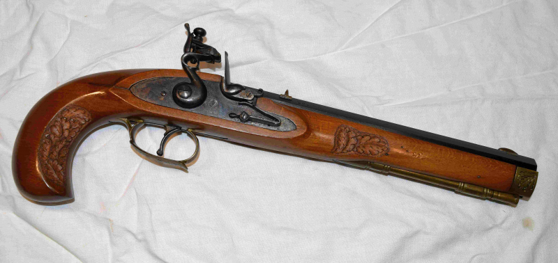 Schöne vermtl. Kentucky Steinschloss-Vorderlader Pistole im Cal. 44 mit Achtkantlauf. Diese ist in gutem Zustand. Nur leichte Macken, jedoch ein sichtbarer Kratzer im Schaft ( siehe Bilder ) rechte Seite hinter der Schlossplatte. Die Funktion ist dadurch nicht beeinträchtigt.