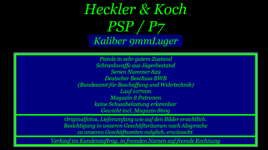 Artikel-ID: 20344202  •  ArtikelNr. des Verkäufers: 12865  •  Kategorie: Grosskaliber Kurzwaffen > Gebrauchspistolen > Heckler & Koch