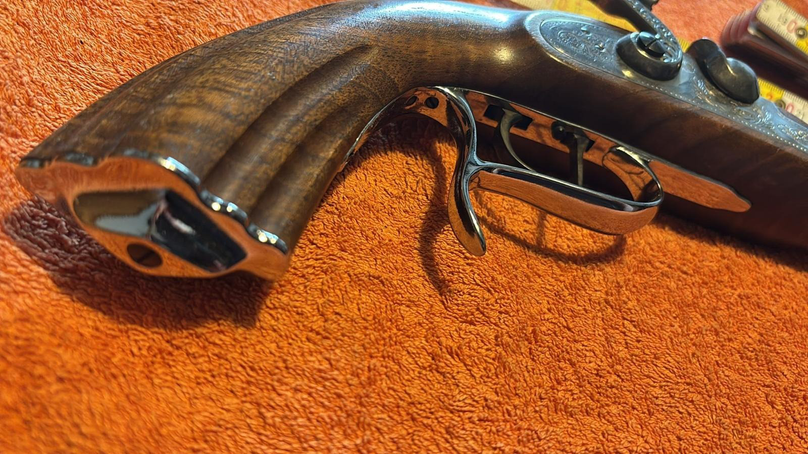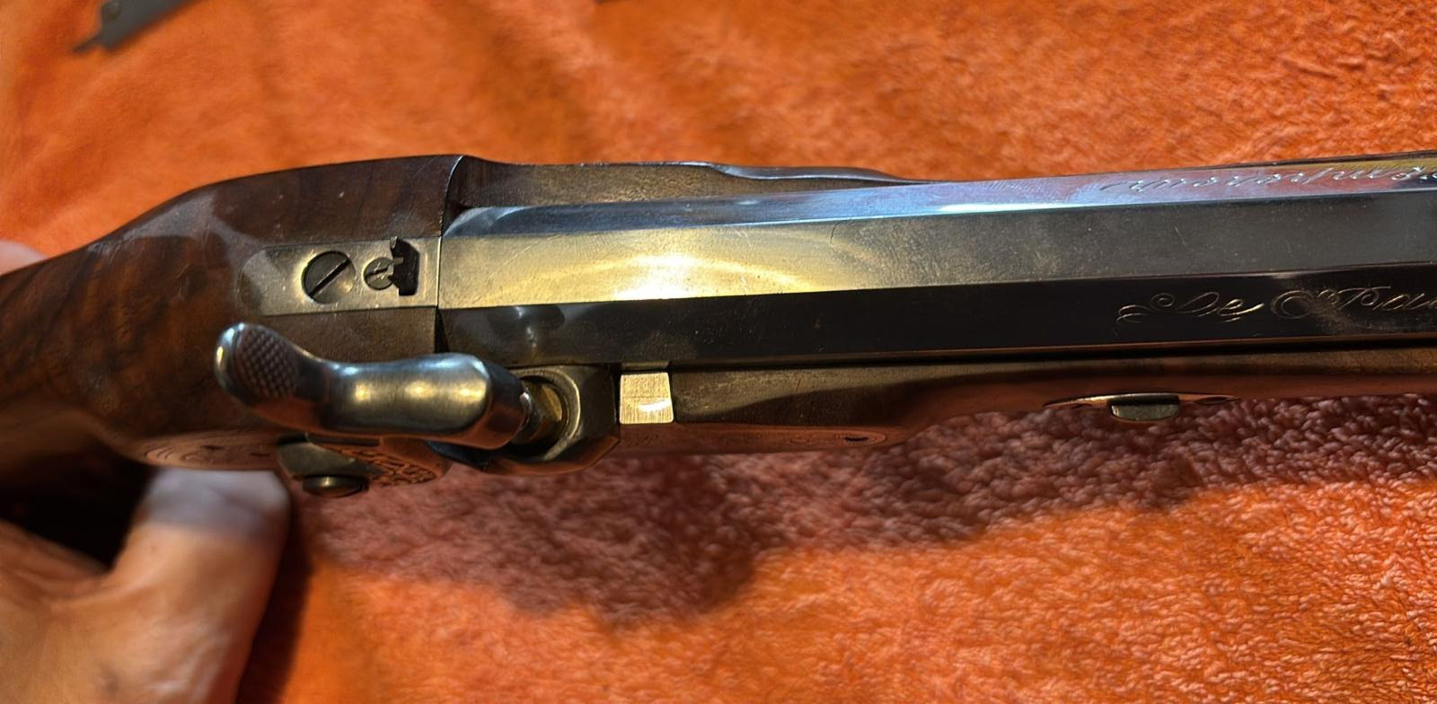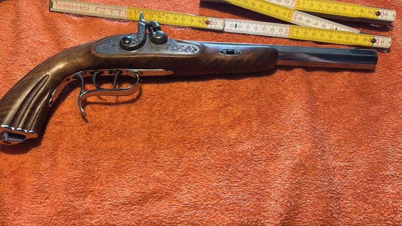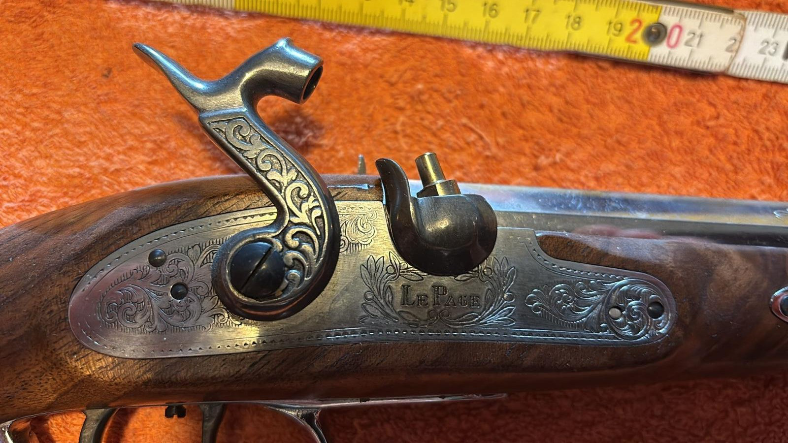 Mit dieser Le Page wurde nur einmal geschossen, von daher ist sie für mich in einem neuwertigen Zustand. Bei der Vorderlader Pistole handelt es sich um Kaliber 45. Einen Koffer habe ich leider nicht mehr dazu.