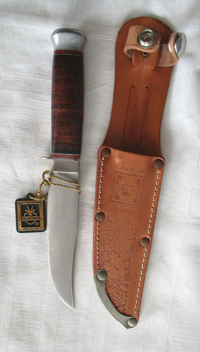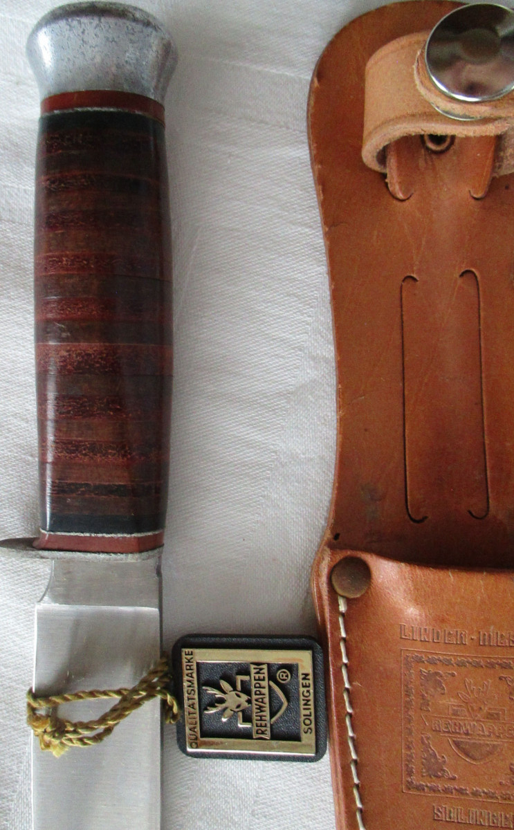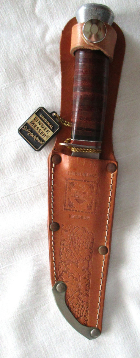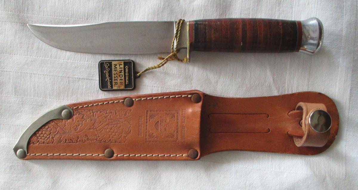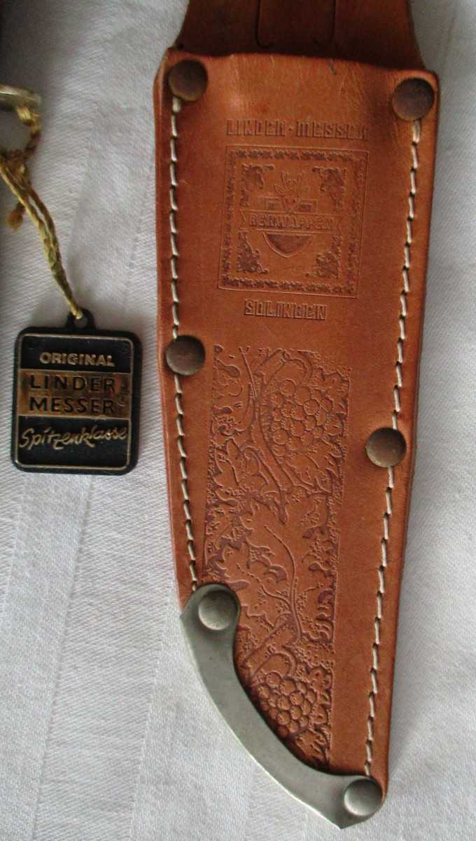 Die ca. 12 cm lange Klinge ist handgeschmiedet. Die Klinge und die originale Lederscheide sind mit Solingen und Linder – Messer graviert - geprägt.