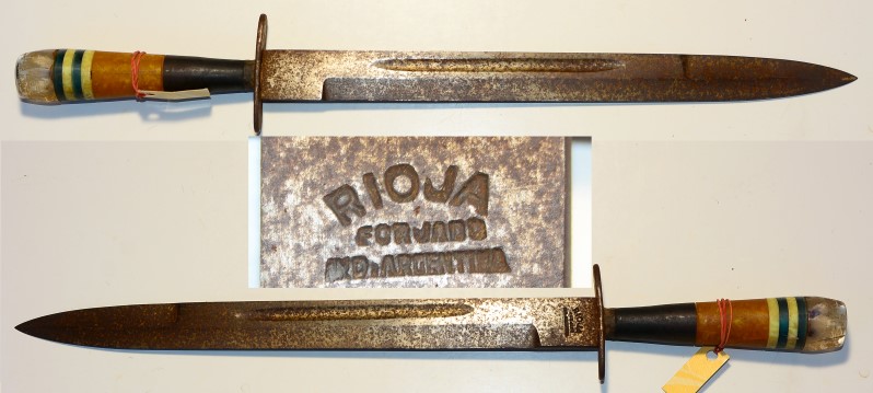 Unbekannter Dolch mit typischer Bajonettklinge, diese wohl argentinisch, Griff aus mehreren wohl aus Kunststoff bestehenden Elementen, Klingenlänge 29,8 cm, im Griff 2 kleine Altersrisse, ohne Scheide
