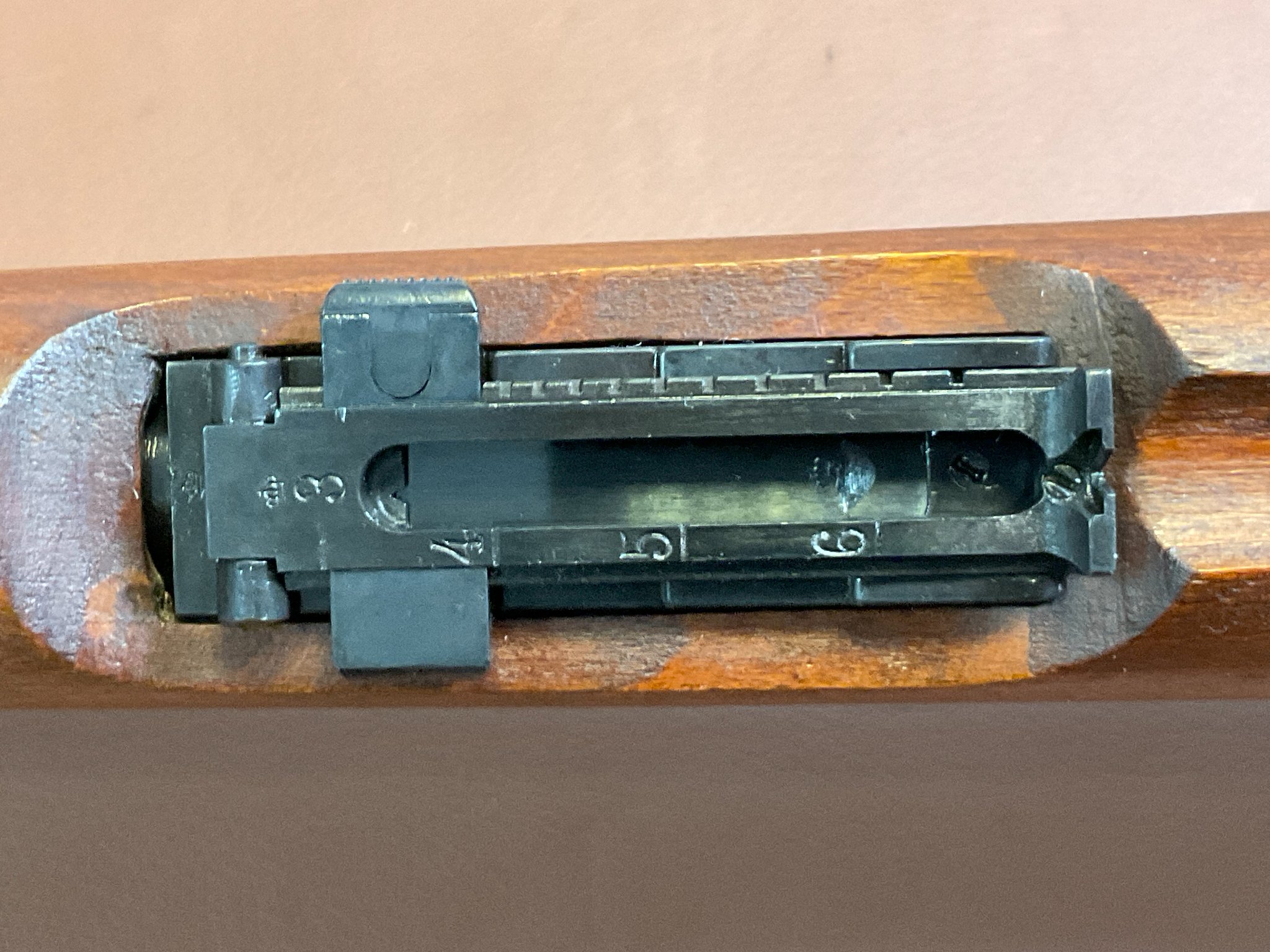 Die Waffe ist nummerngleich und mit der Standardvisierung (Schiebvisier) ausgestattet. Zusätzlich verfügt sie über ein erhöhtes Sportkorn.