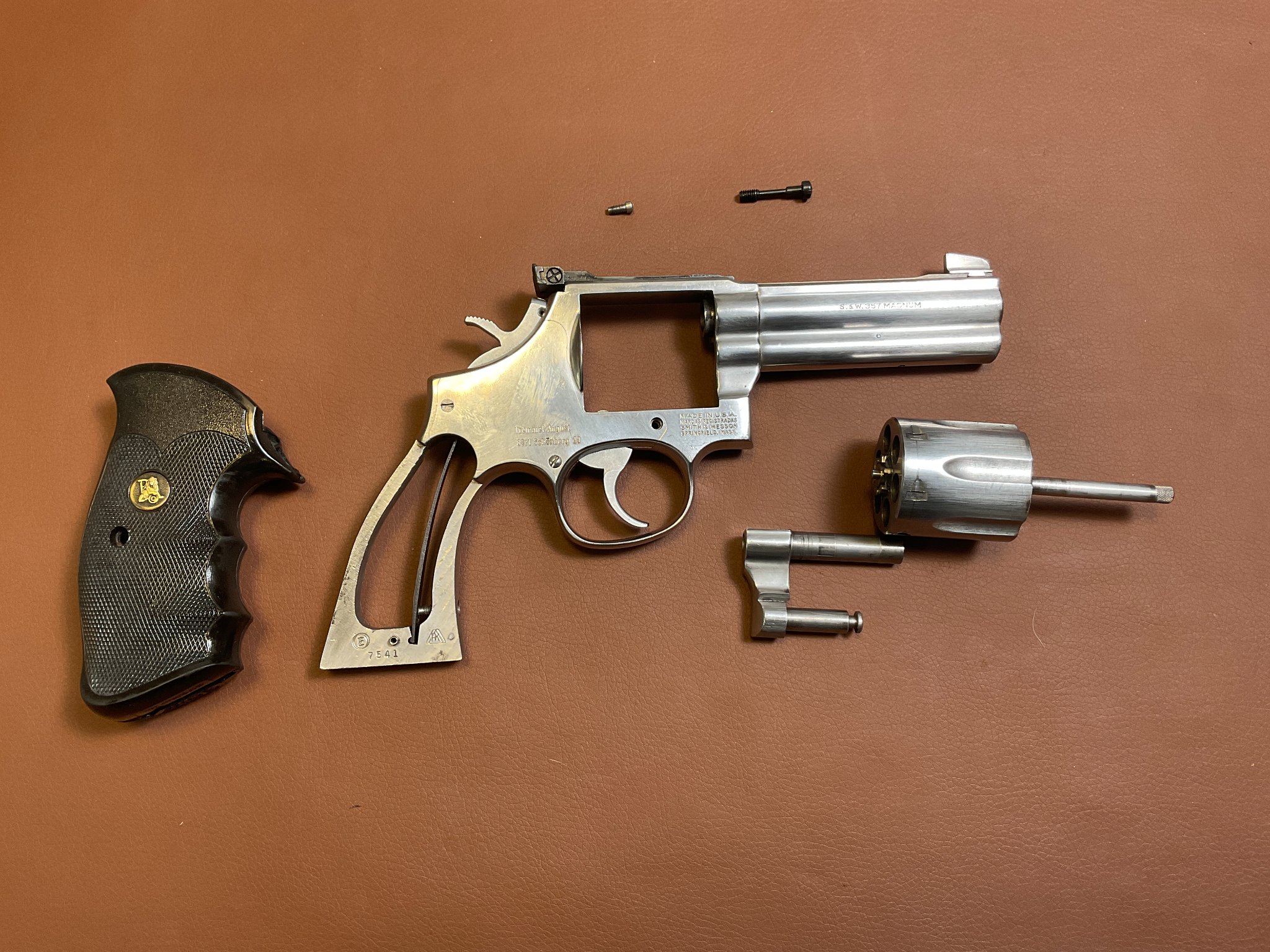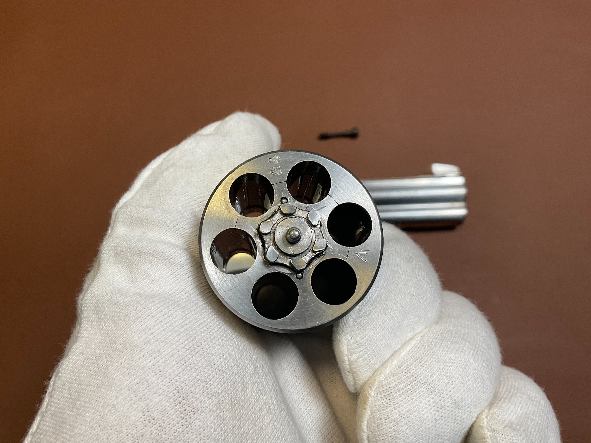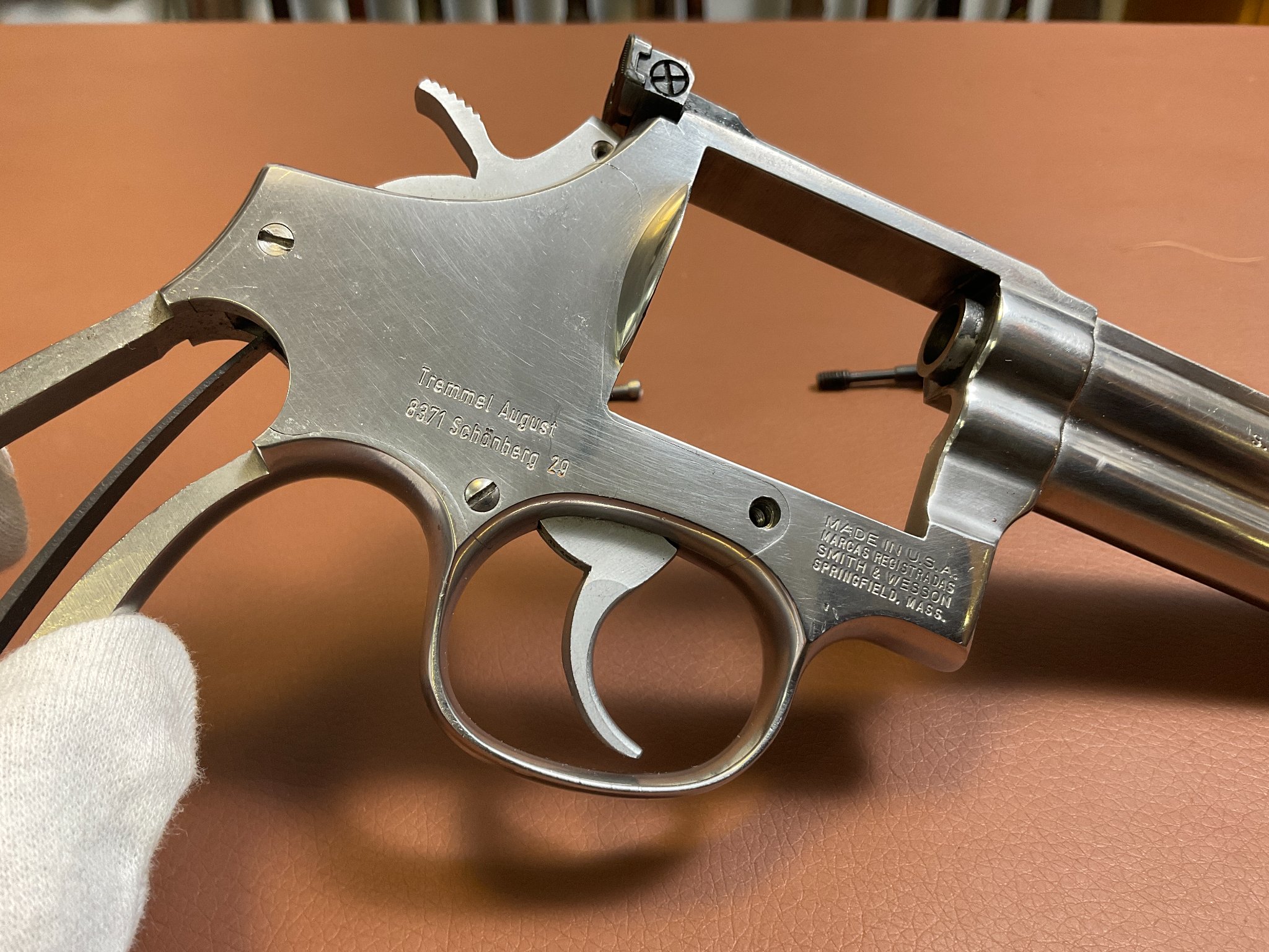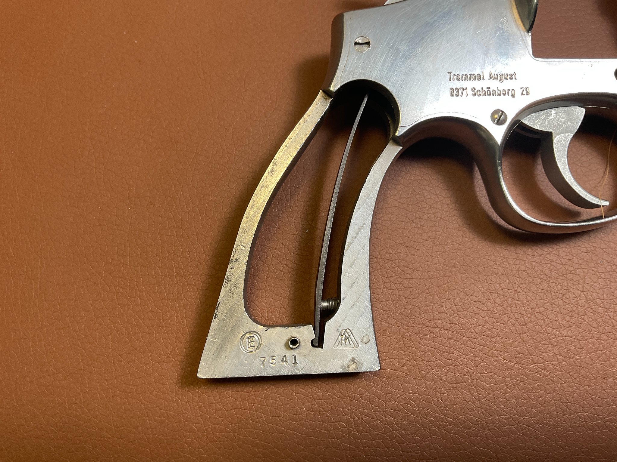 Unter der rechten Griffschale befindet sich eine Gravur des Vorbesitzers. Der Revolver weist leichte, altersbedingte Gebrauchsspuren auf, befindet sich jedoch insgesamt in einem guten Zustand.